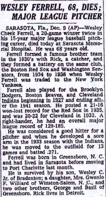 The Obit For Wes Ferrell
